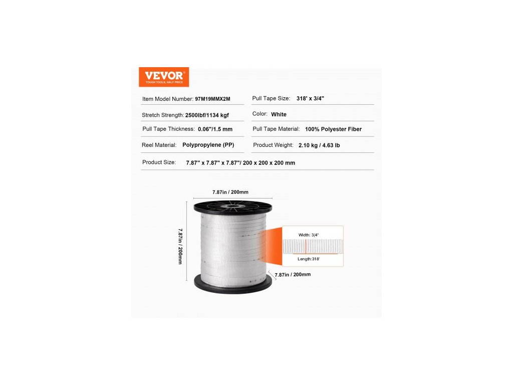 Rozměry tažné pásky: 318' x 3/4" (96,9 m x 1,9 cm),Materiál tažné pásky: 100% polyesterové vlákno,Barva: Bílá,Číslo modelu položky: 97M19MMX2M,Hmotnost výrobku: 4,63 lbs/2,10 kg,Pevnost v tahu: 2500 lbf/1134 kgf,Tloušťka tažné pásky: 0,06"/1,5 mm,Materiál cívky: Polypropylen (PP), rozměry produktu: 7,87" x 7,87" x 7,87" / 200 x 200 x 200 mm