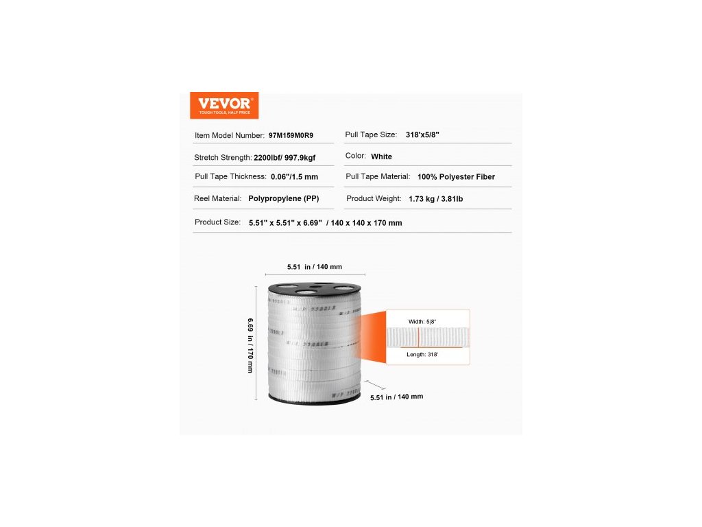 Rozměry tažné pásky: 318' x 5/8" (96,9 m x 1,6 cm),Materiál tažné pásky: 100% polyesterové vlákno,Barva: Bílá,Číslo modelu položky: 97M159M0R9,Hmotnost výrobku: 3,81 lbs/1,73 kg,Pevnost v tahu: 2200 lbf/998 kgf,Tloušťka tažné pásky: 0,06"/1,5 mm,Materiál cívky: Polypropylen (PP), rozměry produktu: 140 x 140 x 170 mm