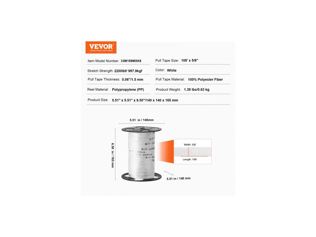 Rozměry tažné pásky: 108' x 5/8" (33 m x 1,6 cm),Materiál tažné pásky: 100% polyesterové vlákno,Barva: Bílá,Číslo modelu položky: 33M159MXK8,Hmotnost výrobku: 1,39 lbs/0,63 kg,Pevnost v tahu: 2200 lbf/998 kgf,Tloušťka tažné pásky: 0,06"/1,5 mm,Materiál cívky: Polypropylen (PP),Rozměry výrobku: 5,51" x 5,51" x 6,50" / 140 × 140 × 165 mm