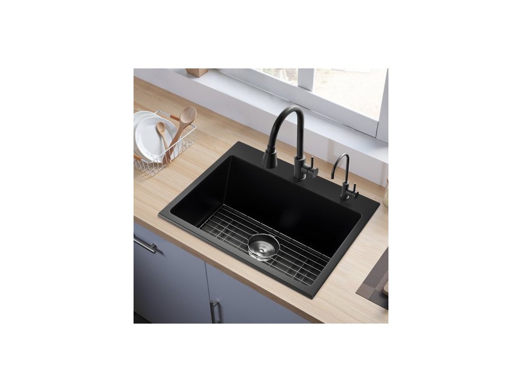 Pracovní stanice s kuchyňským dřezem 63 cm, žulové dřezy s horní montáží, vestavné umyvadlo ve farmářském stylu s mnoha příslušenstvím, dřezy do myčky nádobí pro karavany, přípravné kuchyně a bary (černá)