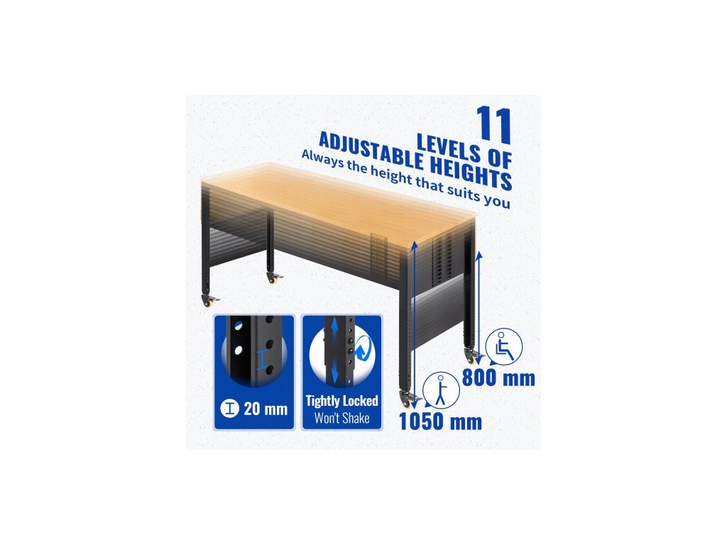 Pracovní stůl s nastavitelnou výškou, garážový stůl 155 x 51 cm s výškou 80–105 cm a nosností 720 kg, se zásuvkami, dřevěnou deskou, kovovým rámem a otočnými kolečky, pro kancelář, domácí dílnu