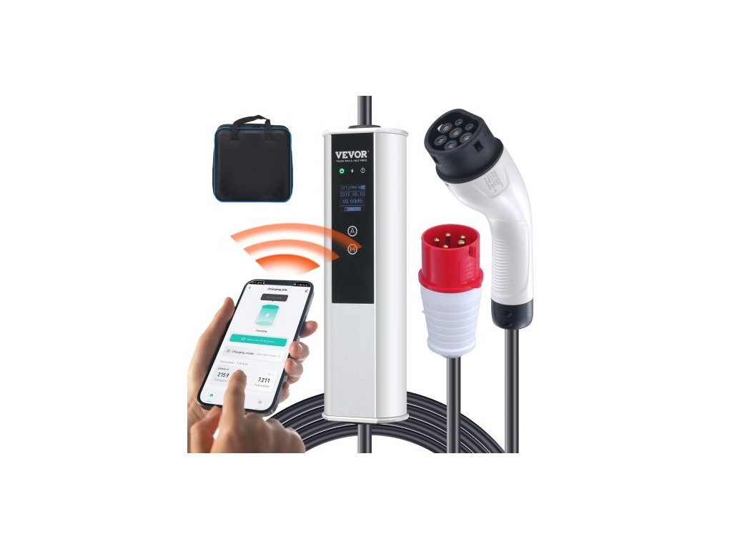 Přenosná nabíječka elektromobilů Typ 2, 16A 3,68 kW/11 kW, Nabíječka elektromobilů do auta s 7,5m nabíjecím kabelem, zástrčka CEE 16 LCD, Domácí nabíjecí stanice pro elektromobily IEC 62196 s přepravní taškou a hákem na nabíjecí kabel, IP66