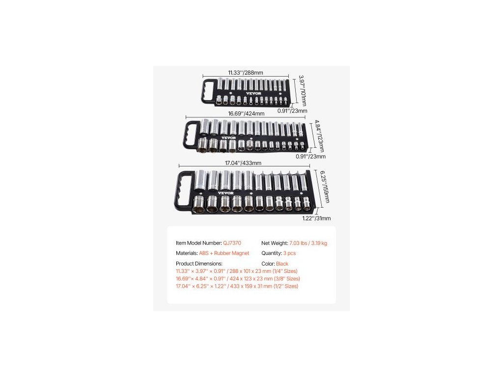 16,69''× 4,84'' × 0,91'' / 424 x 123 x 23 mm (velikosti 3/8´´):,17,04'' × 6,25'' × 1,22'' / 433 x 159 x 31 mm (velikosti 1/2´´):,Materiály: ABS + gumový magnet,11,33'' × 3,97'' × 0,91'' / 288 x 101 x 23 mm (velikosti 1/4"):,Barva: Černá,Číslo modelu položky: QJ7370,Množství: 3 ks,Rozměry produktu:,Čistá hmotnost: 7,03 lbs / 3,19 kg