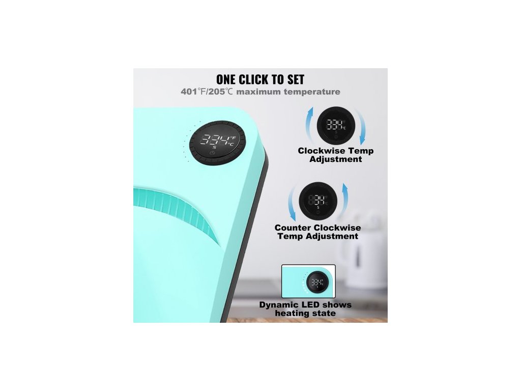Rozměry topné desky: 9 × 9 palců/22,8 x 22,8 cm,Časový rozsah: 1–999 s,Čistá hmotnost: 5,5 lbs/2,5 kg,Příkon: 670 W,Teplotní rozsah: 40–205 °C/104–401 °F,Rozměry produktu: 10 × 10 × 3 palce/24,7 × 24,7 × 7,4 cm