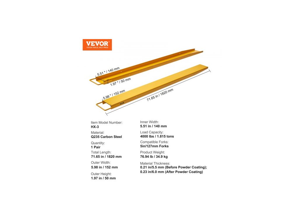 Celková délka: 71,65 palce/1820 mm,Vnější výška: 1,97 palce/50 mm,Nosnost: 4000 lbs/1,815 tun,Kompatibilní vidle: Vidle 5 palců/127 mm,Číslo modelu položky: HX-3,Vnější šířka: 5,98 palce/152 mm,Hmotnost výrobku: 76,94 lbs/34,9 kg,Množství: 1 pár,Materiál: Uhlíková ocel Q235, vnitřní šířka: 5,51 palce/140 mm
