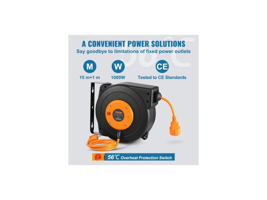 Navíjecí prodlužovací kabel na cívce, 15 m, 1000W odolný navíjecí napájecí kabel s přívodním kabelem o délce 1 m, ochrana proti přehřátí, PP plášť, otočný držák o 180° pro montáž na strop nebo na zeď