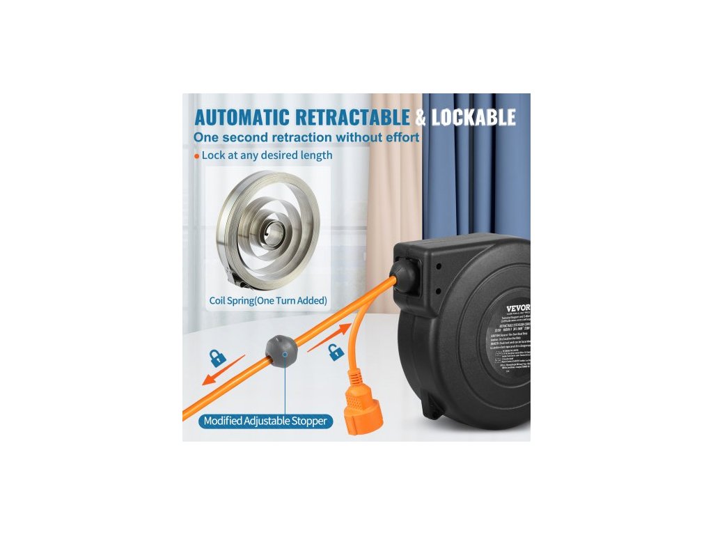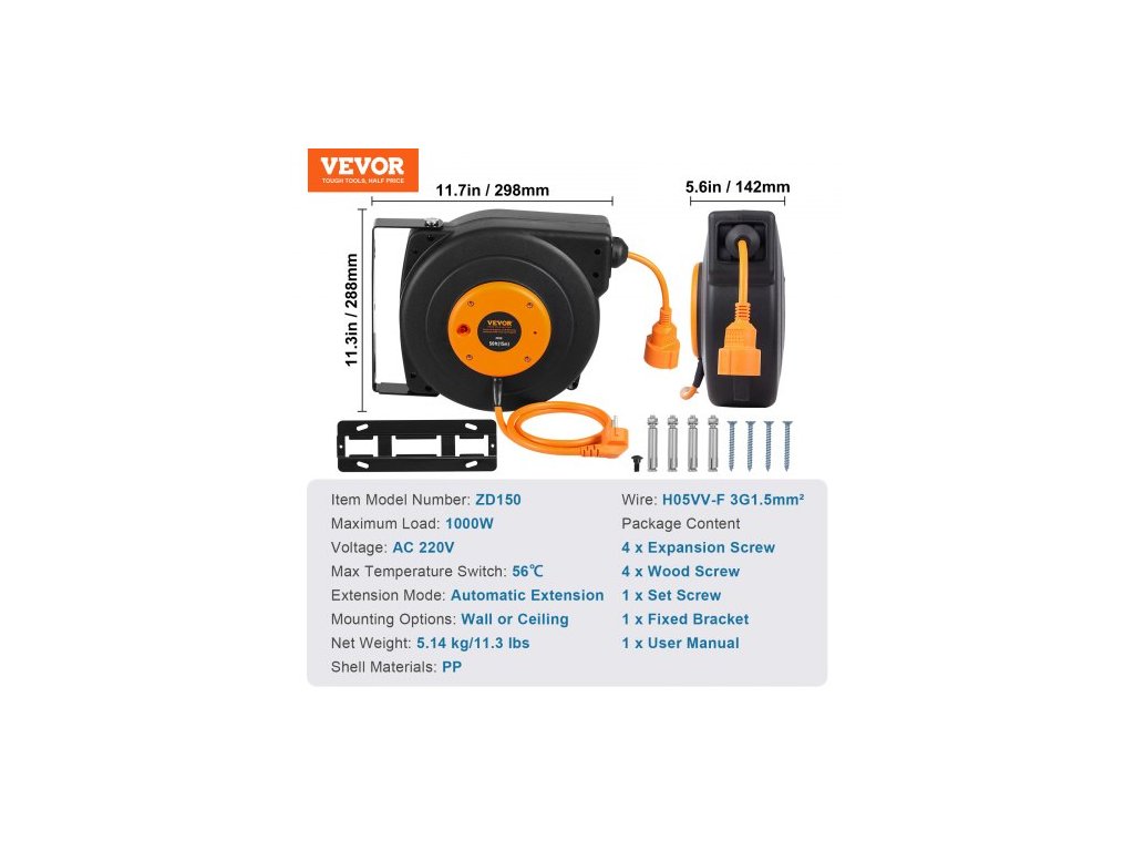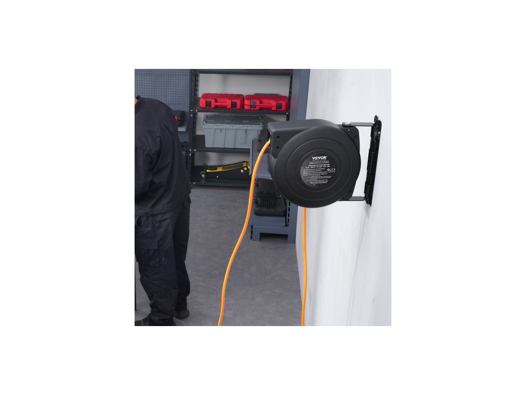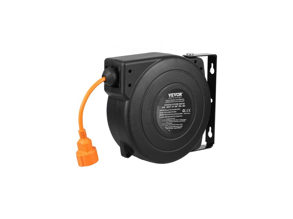 Prodlužovací kabel s navíjecím kabelem, 15 m, 1000W odolný navíjecí kabel s přívodním kabelem o délce 1 m, ochrana proti přehřátí, PP pouzdro, otočný držák o 180° pro montáž na strop nebo na zeď