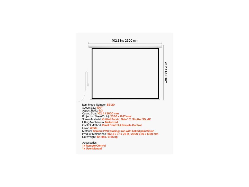 Velikost plátna: 120 palců, Velikost pouzdra: 102,4 / 2600 mm, Materiál plátna: Pletená látka, Zisk 1,2, Shutter 3D, 4K, Způsob ovládání: Ovládání panelem a dálkové ovládání, Barva: Bílá, Číslo modelu položky: ES120, Zvedací mechanismus: Motorizovaný, Velikost projekce (Š x V): 2330 x 1747 mm, Materiál: Plátno: PVC; Pouzdro: Železo s vypálenou barvou, Rozměry výrobku: 2600 x 80 x 1930 mm, Čistá hmotnost: 8,65 kg ±3 %, Poměr stran: 4:3