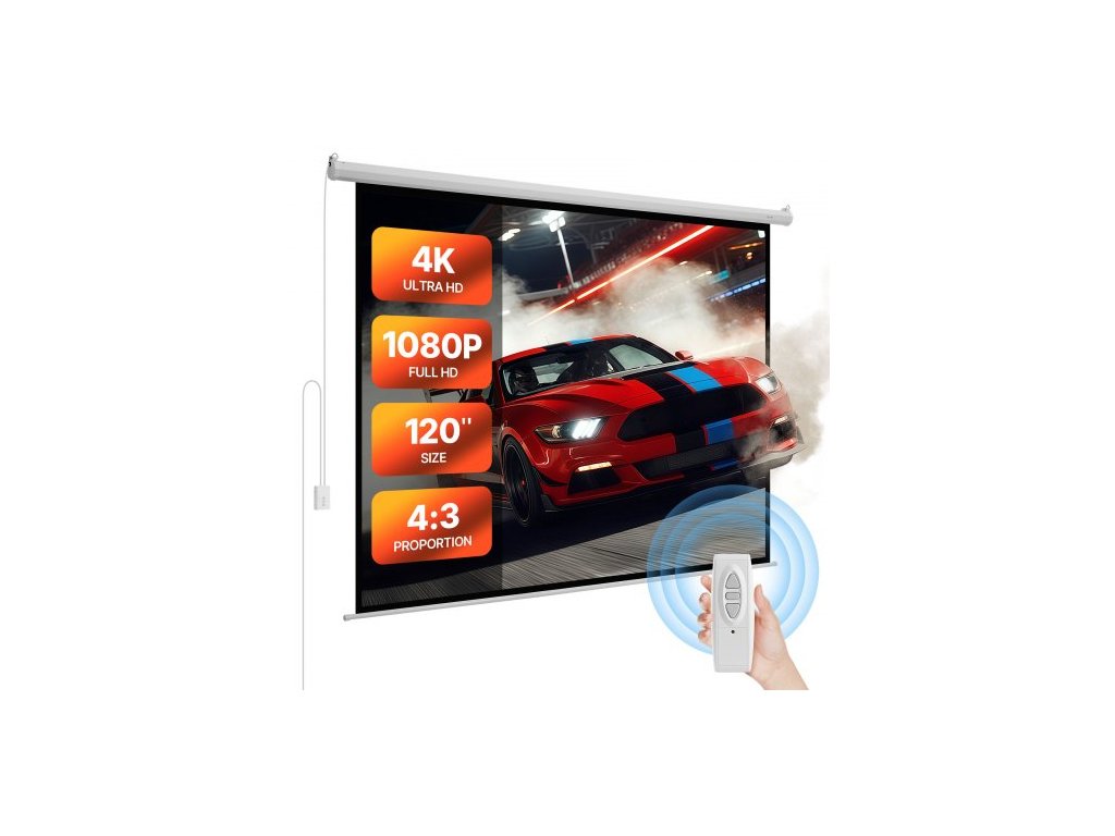 Projekční plátno s motorem, 3048 mm 4:3 1080 HD elektrické projekční plátno, nástěnný projekční displej s dálkovým ovládáním, automatické filmové plátno pro rodinné domácí kancelářské kino