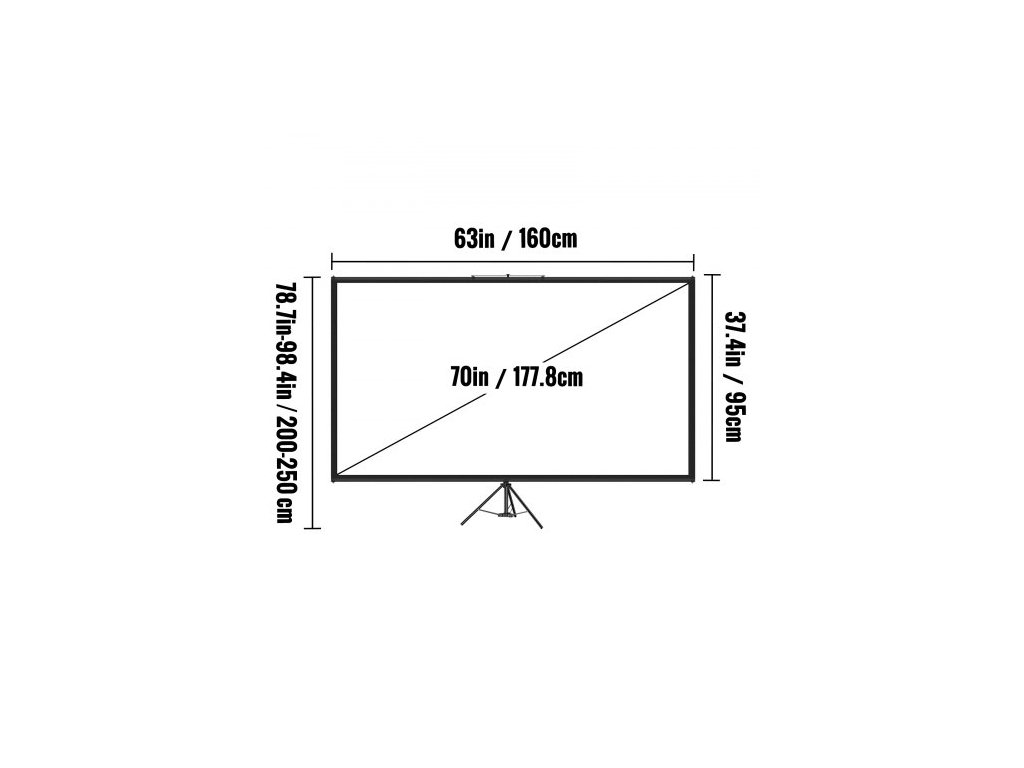 Rozlišení obrazovky: 4K HD,Materiál stativu: Hliníková slitina,Typ stojanu: Stativ,Úhlopříčka: 70"/177,8 cm,Pozorovací úhel: 160 stupňů,Materiál obrazovky: Polyester a omyvatelný povrch,Model: DM-ABS-70,Hmotnost výrobku: 16,5 lbs/7,5 kg,Výška stojanu: 78,7"-98,4"/200-250 cm (nastavitelný),Poměr stran: 16:9, Plocha obrazu (Š x V): 63" x 37,4" / 160 x 95 cm