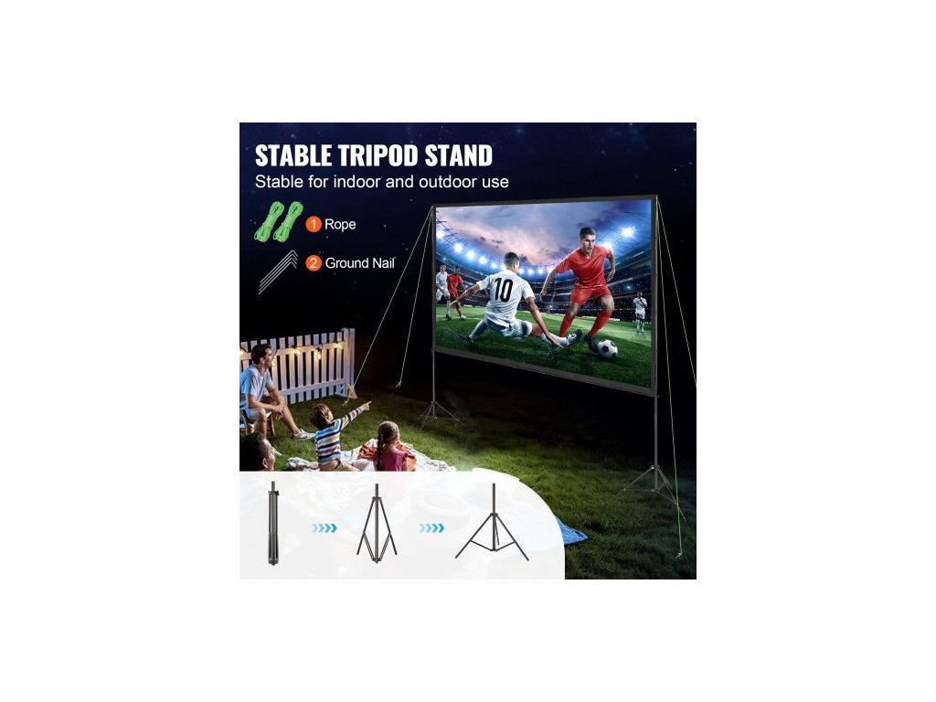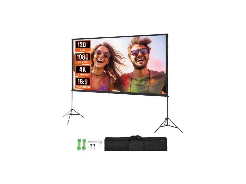 Projekční plátno se stojanem, 120 palců 16:9 4K 1080 HD venkovní filmové plátno se stojanem, projekční plátno bez záhybů se stativmi a přepravní taškou, pro domácí kino, filmový večer na zahradě