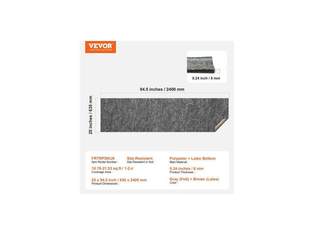 Čistá hmotnost (včetně veškerého příslušenství): 5,14 lbs / 2,33 kg ±3%,Barva: Šedá (plsť) + Hnědá (latex),Číslo modelu položky: FRTRPSKU6,Tloušťka výrobku: 0,24 palce / 6 mm (+1/-0 mm),Plocha krytí: 16,4 čtverečních stop / 1,52m^2,Rozměry výrobku: 25 x 94,5 palce / 635 x 2400 mm,Hlavní materiál: Polyester + Latexové dno