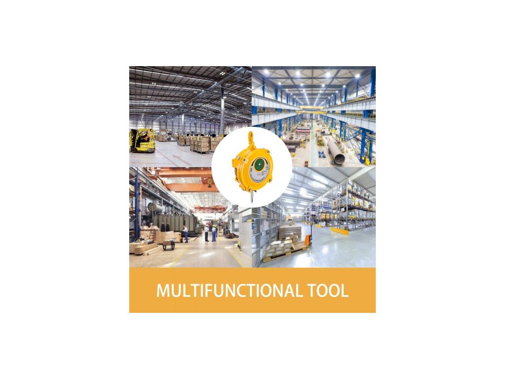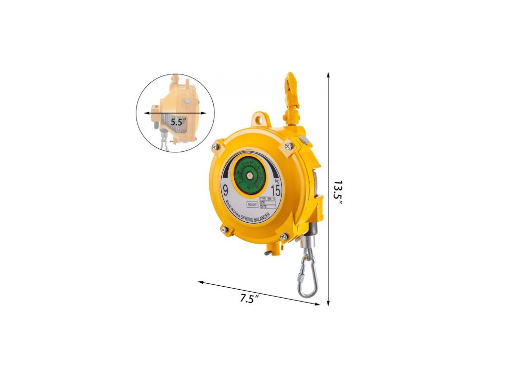 Pružinový vyvažovač 20-33 liber (9-15 kg) Zatahovací držák nářadí Vyvažovač nářadí o délce 1,5 m s hákem a ocelovým lanem Nastavitelný vyvažovač s navíječem Závěsné upevňovací zařízení ve žluté barvě