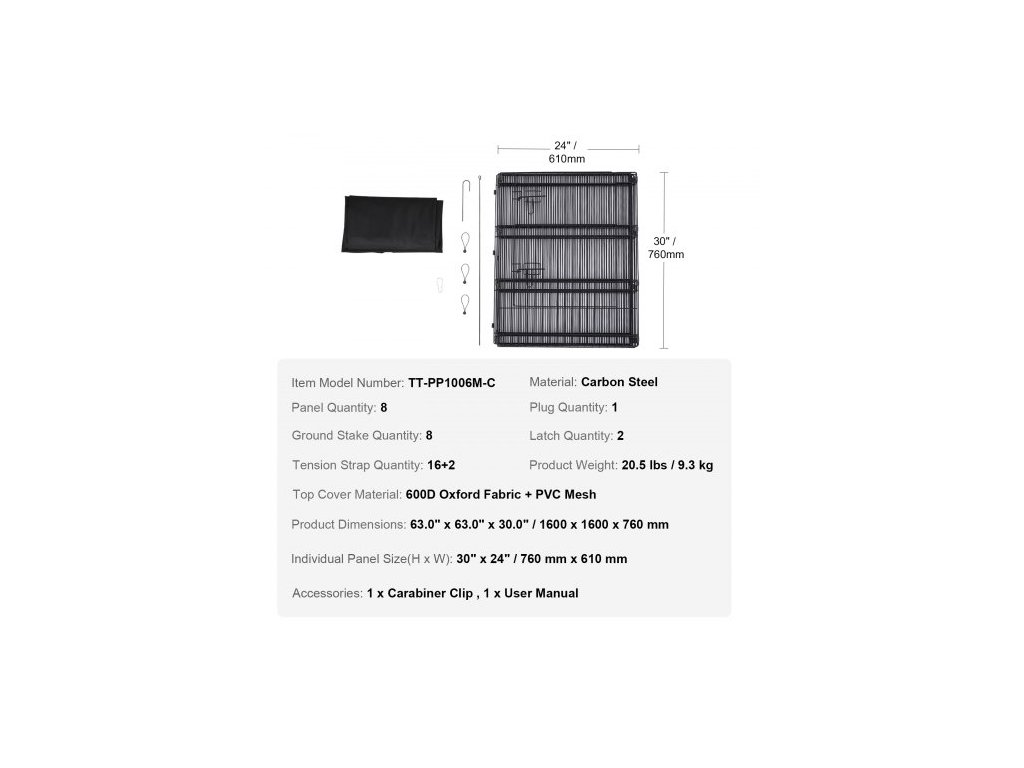 Počet západek: 2,Počet panelů: 8,Materiál vrchního krytu: oxfordská látka 600D + PVC síťovina,Číslo modelu položky: TT-PP1006M-C,Hmotnost výrobku: 9,3 kg,Materiál: Uhlíková ocel,Počet zástrček: 1,Počet napínacích popruhů: 16+2,Rozměry výrobku: 153,5 cm x 153,5 cm x 76,5 cm / 1600 x 1600 x 760 mm,Rozměry jednotlivých panelů (V x Š): 30" x 24" / 760 mm x 610 mm,Množství zemních kolíků: 8