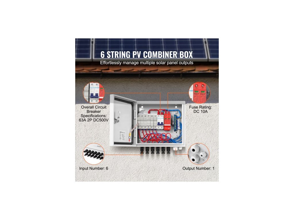 PV sběrná krabice, 6 stringů, solární sběrná krabice s pojistkou jmenovitý proud 10 A, jističem 63 A, bleskojistkou a solárním konektorem, ocelové pouzdro pro solární panely zapínané/vypínané, IP65
