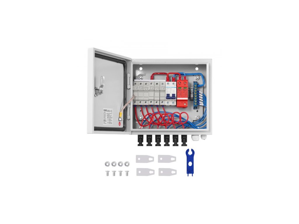 PV sběrná krabice, 6 stringů, solární sběrná krabice s pojistkou 10 A, jističem 63 A, bleskojistkou a solárním konektorem, ocelové pouzdro pro solární panely zapínané/vypínané, IP65
