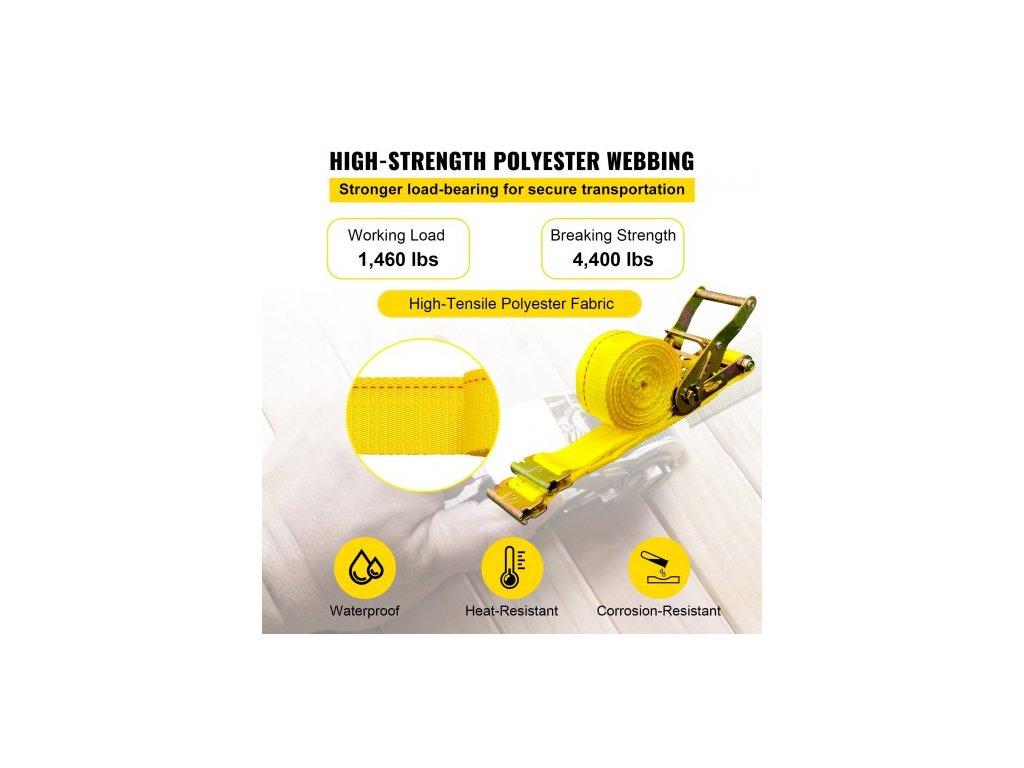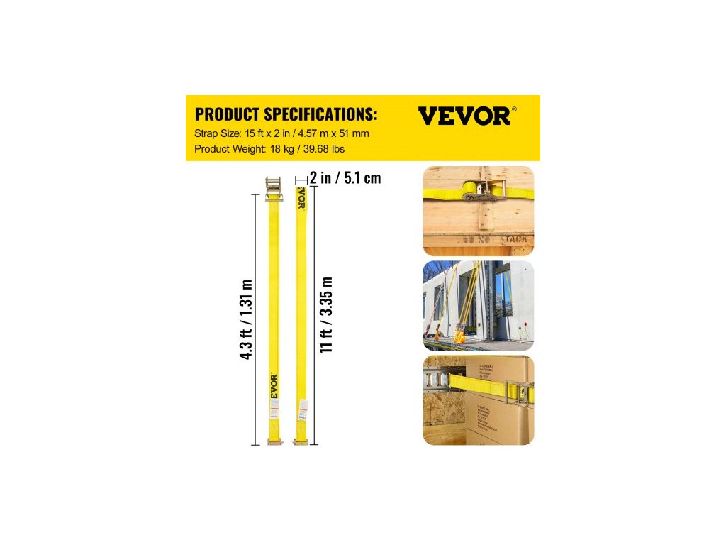 Bezpečné pracovní zatížení: 1460 lbs / 660 kg,Max. pevnost v tahu: 4400 lbs / 2 000 kg,Barva: Žlutá,Model: VV-RS-TD1815,Hmotnost výrobku: 18 kg / 39,68 lbs,Materiál: Legovaná ocel, Polyester,Rozměry popruhu: 15 stop x 2 palce / 4,57 m x 5 cm