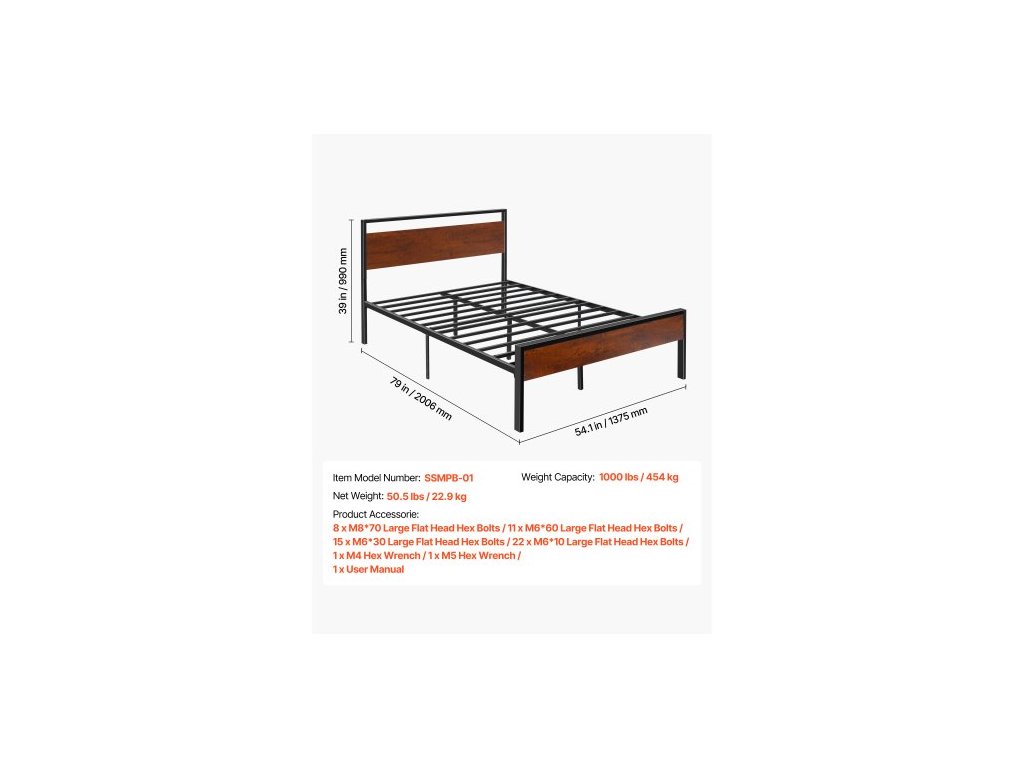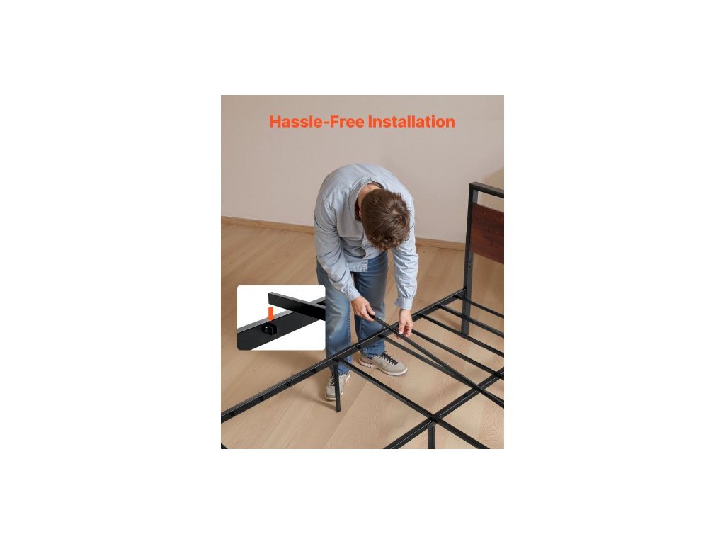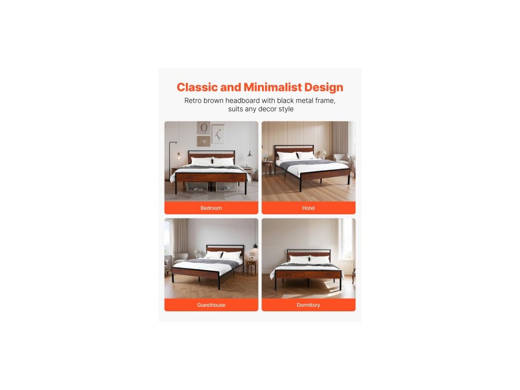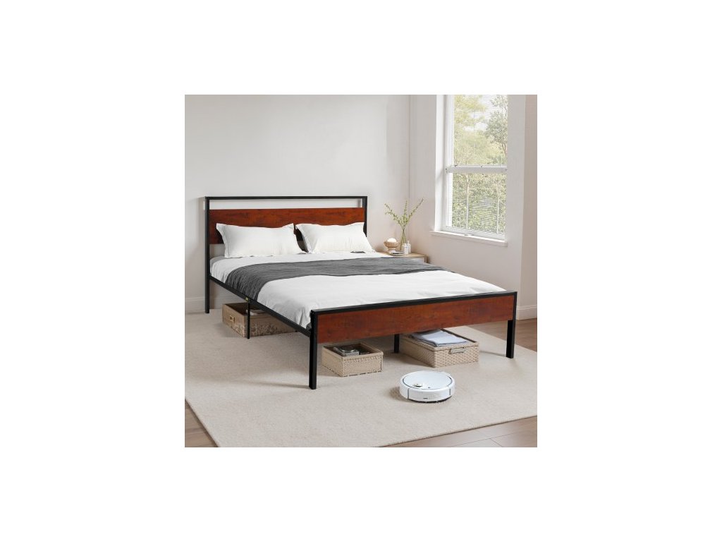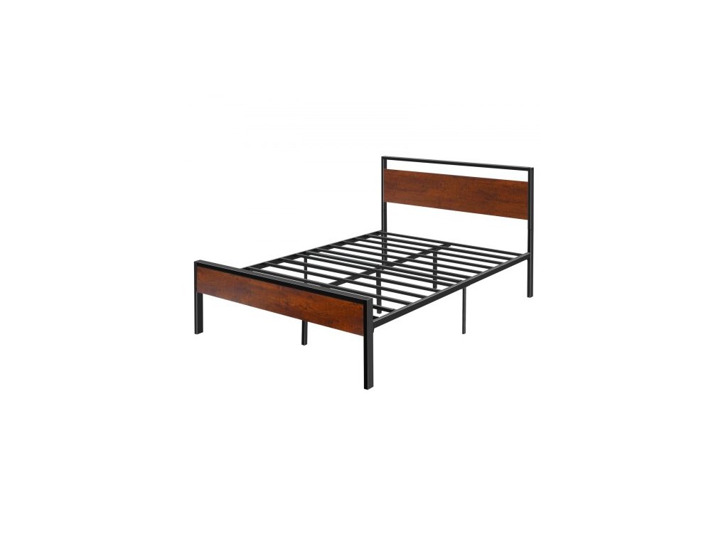 Rám postele Full Size, 35 cm černý kovový rám postele s retro hnědým dřevěným čelem a nohou, velký úložný prostor pod postelí, protiskluzový a nehlučný povrch, bez nutnosti pružinového roštu, snadná montáž