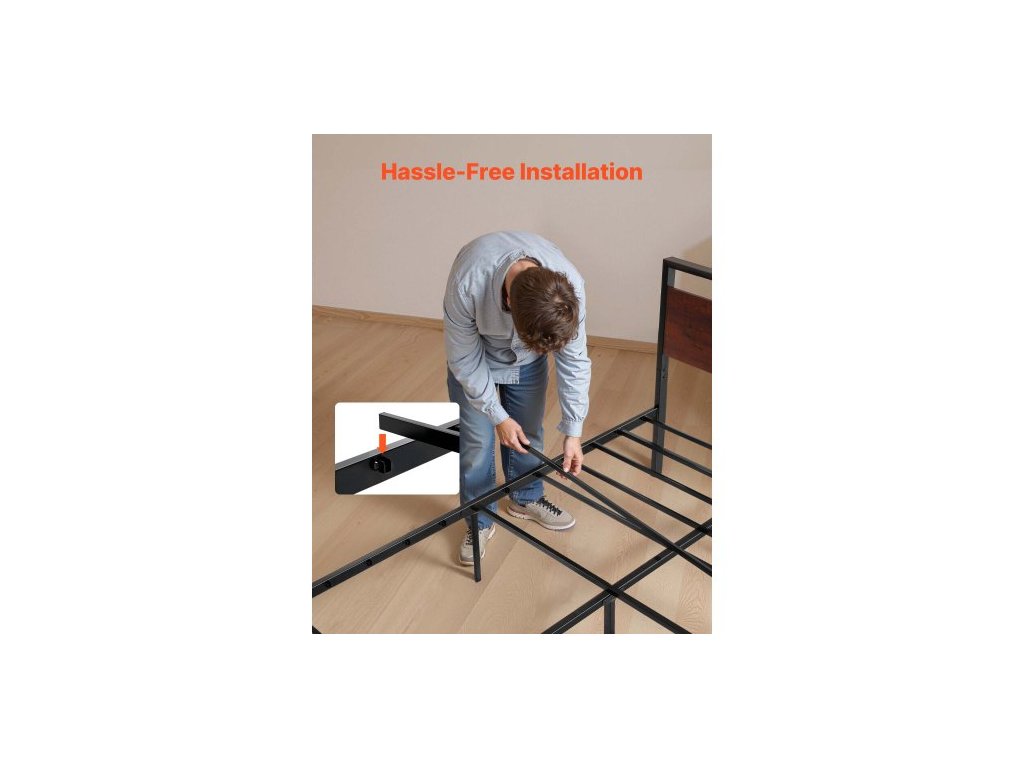 Rám postele velikosti Queen Size, 35 cm černý kovový rám postele s retro hnědým dřevěným čelem a nohou, velký úložný prostor pod postelí, protiskluzový a nehlučný povrch, bez nutnosti pružinového roštu, snadná montáž