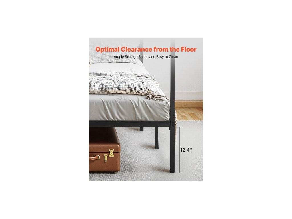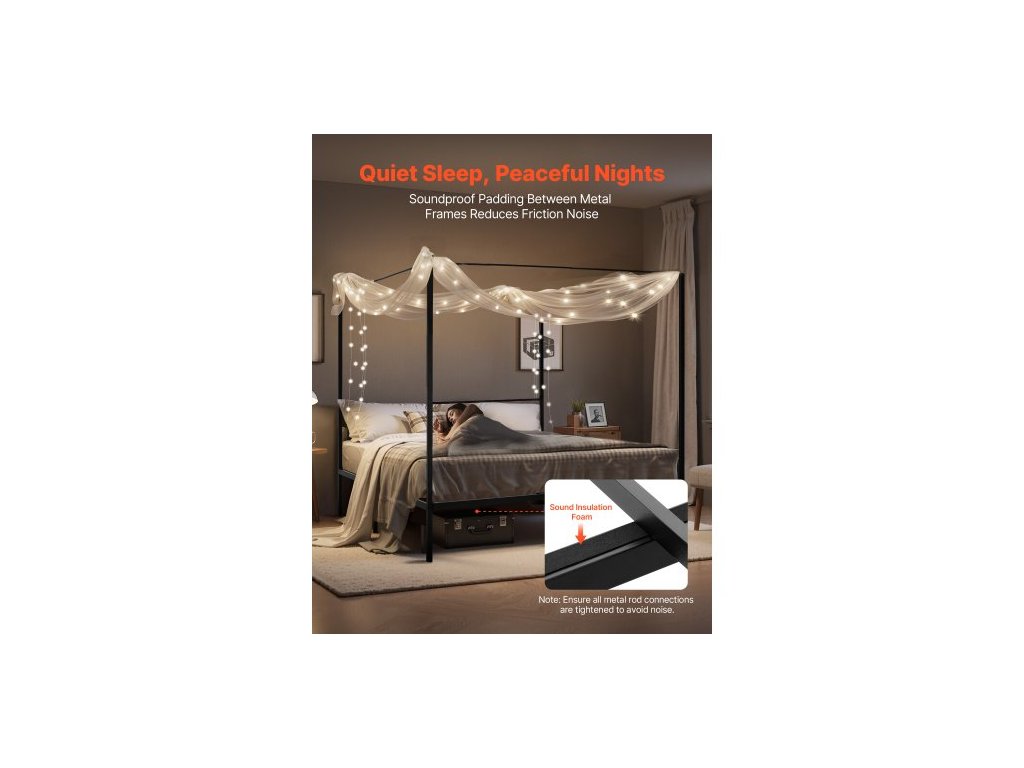 Rám postele s nebesy velikosti King, kovová postel s nebesy a designem čtyř nebes, odolné ocelové lamely, úložný prostor pod postelí, bez nutnosti pružinového roštu, snadná montáž, černá
