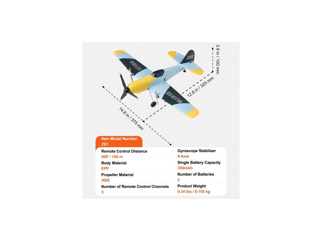 Materiál vrtule: ABS, Doba plného nabití: přibližně 60 min, Kapacita jedné baterie: 350 mAh, Doba výdrže jedné plné baterie: přibližně 15 min, Velikost výrobku: 12,8 x 14,8 x 3,9 palce/325 x 375 x 100 mm, Design: stíhací letoun z druhé světové války, Materiál těla: EPP, Počet baterií: 2, Dosah dálkového ovládání: 500'/150 m, Gyroskopický stabilizátor: 6osý, Číslo modelu položky: Z61, Hmotnost produktu: 0,155 kg, Počet kanálů dálkového ovládání: 3, Rozpětí křídel: 37,5 cm