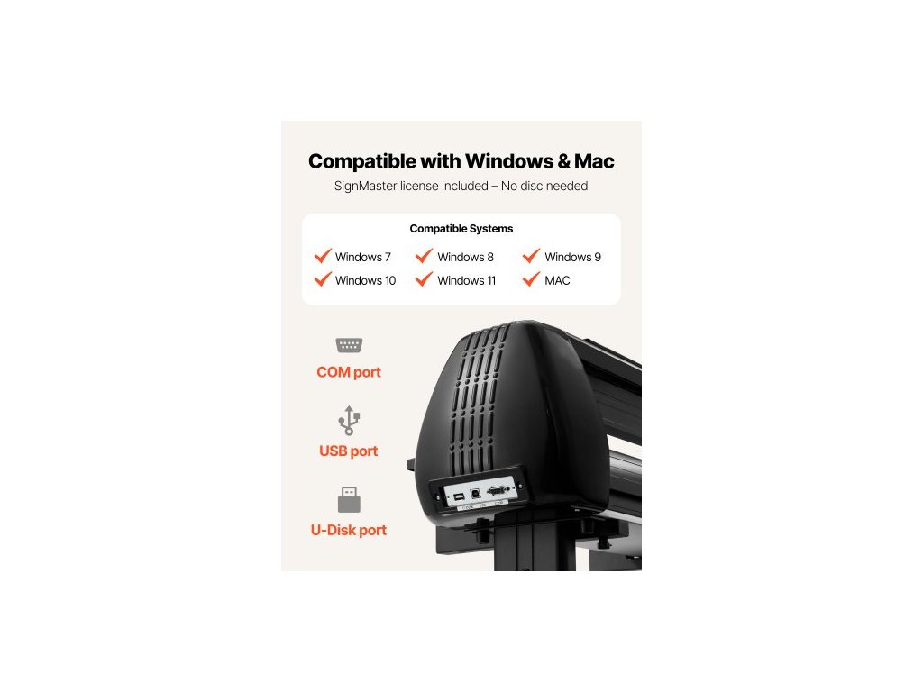 Řezačka vinylu , maximální šířka podávání 1350 mm, dva nože, nastavitelná síla a rychlost, LED displej, řezačka vinylu, tiskárna se softwarem Signmaster pro Windows a macOS