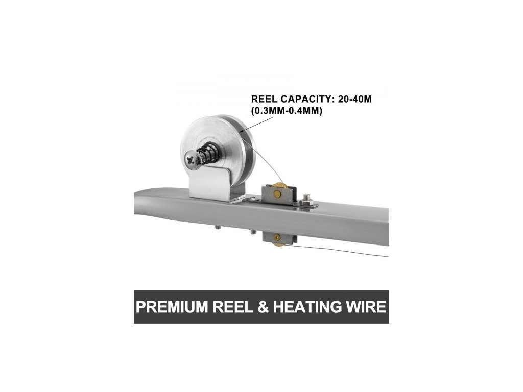 Max. výška řezu: 10,2" (26 cm), Elektrický proud: 3A, Max. šířka řezu: 22" (56 cm), Teplota: 50-300°C (plynule nastavitelná), Tloušťka topného drátu: 0,28 mm, Napětí: 10-240V, Materiál: Ohnivzdorná MDF + slitina, Rozměry výrobku: 30,71 x 12,99 x 2,17" (78 x 33 x 5,5 cm)