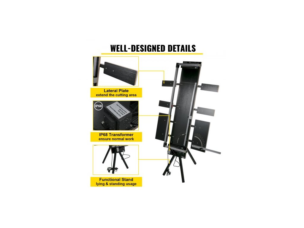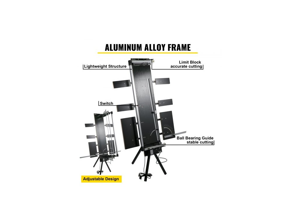 Průměr topného drátu: 0,02" / 0,5 mm,Rozsah zkoseného řezu: 0 - 90°,Rozměry položky: 70,47" x 16,54" x 5,91" / 179 x 42 x 15 cm,Provozní teplota: 360°C / 680°F,Materiál elektrického topného drátu: Gr20Ni80,Materiál rámu: Hliníková slitina,Vstupní napětí: 220V,Maximální délka řezu: 45,28'' / 115 cm,Výstupní napětí: 42 V, Výkon: 200 W, Maximální tloušťka řezu: 42 cm (doporučeno 40 cm), Stupeň vodotěsnosti transformátoru: IP 68