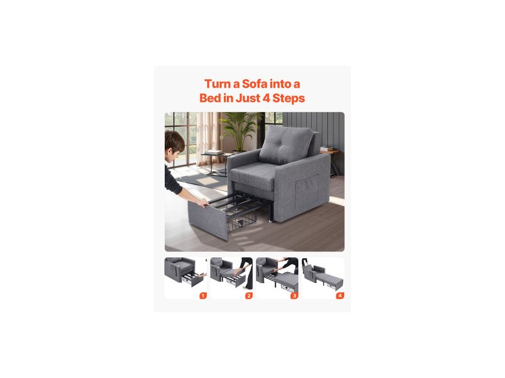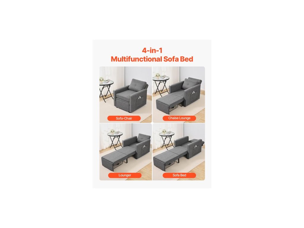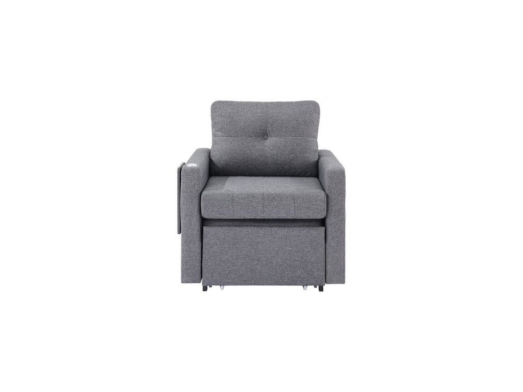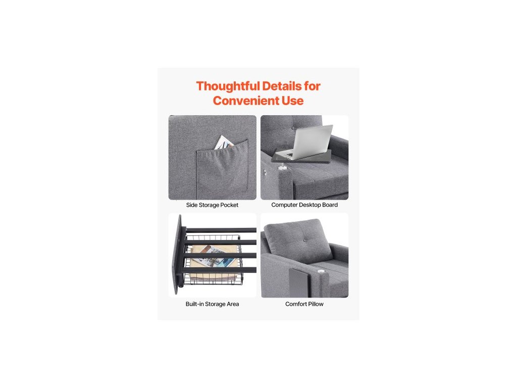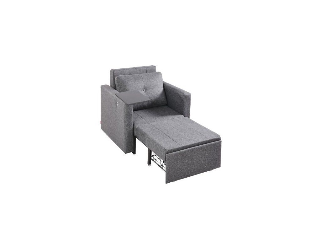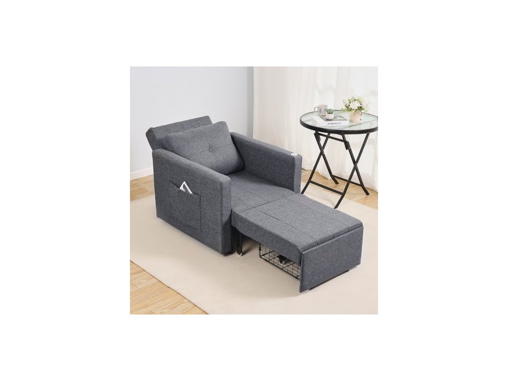 Rozkládací pohovka , rozkládací postel s boční kapsou, polštářem, loketní opěrkou a pracovní deskou, 5 nastavitelných úhlů opěradla, výsuvná pohovka s 2 kolečky a spodním úložným prostorem, šedá