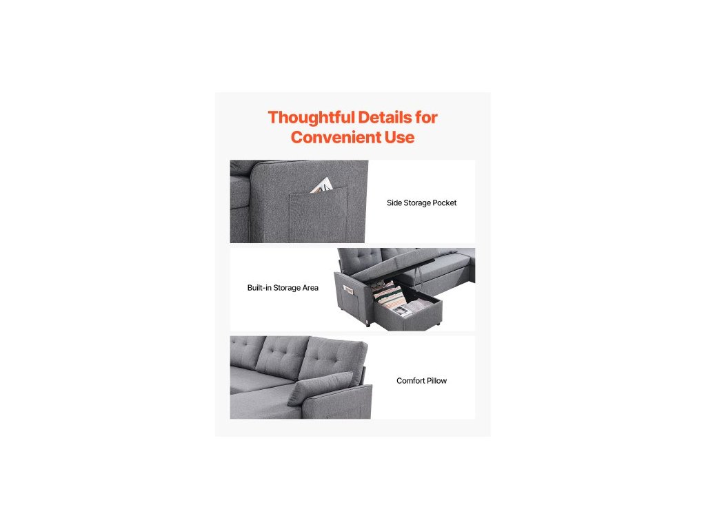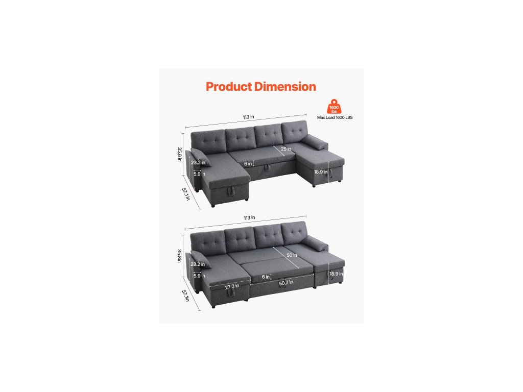 Šířka loketní opěrky: 15 cm, Nosnost: 726 kg, Tloušťka polštáře pohovky: 15,2 cm, Barva: šedá, Rozměry výrobku (pravý úhel): 287 × 145 × 91 cm, Číslo modelu položky: LW-0667-2T-11R-11L, Výška sedáku: 49 cm 48 cm, Materiál: Len; Pěna; Kovový rám; Laminovaná deska, Šířka sedáku pohovky (jednolůžko): 63,5 cm, Čistá hmotnost: 116,4 kg, Výška loketní opěrky: 59 cm