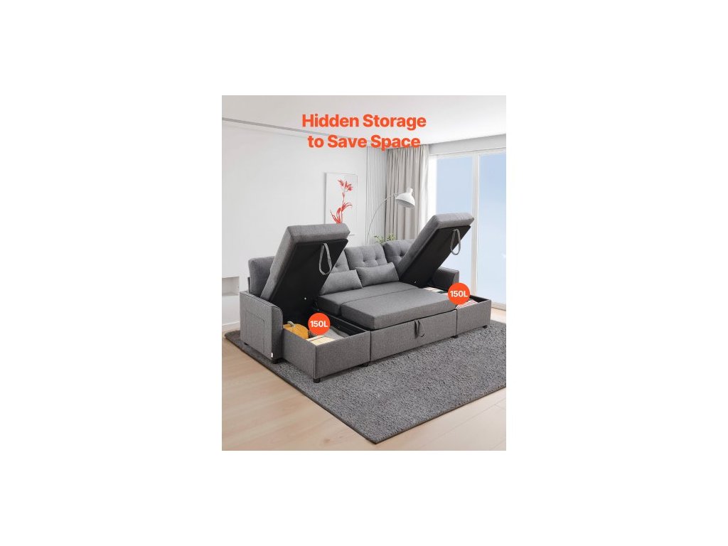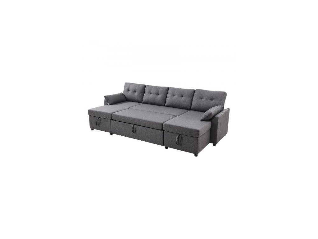 Rozkládací pohovka ve tvaru U, rozkládací pohovka se 2 bočními kapsami, 2 polštáři a dvoulůžkovou lenoškou, 6místná rozkládací pohovka s velkým úložným prostorem do obývacího pokoje, bytu, kovový rám, šedá