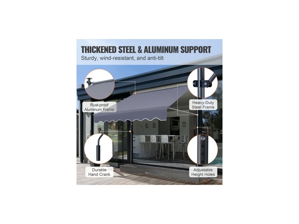 Velikost kliky: 47,2 palce (122,7 cm), Číslo modelu položky: SDA300120, Odolnost proti větru: Úroveň 2, Hmotnost výrobku: 18,5 lbs/8,4 kg (18,5 lbs), Hlavní materiál: Ocel + hliník + oboustranný PU povlak 180G, Úroveň ochrany proti slunci: UV80+ (UV80+), Rozměry výrobku: 118×47 palců (118×47 palců)