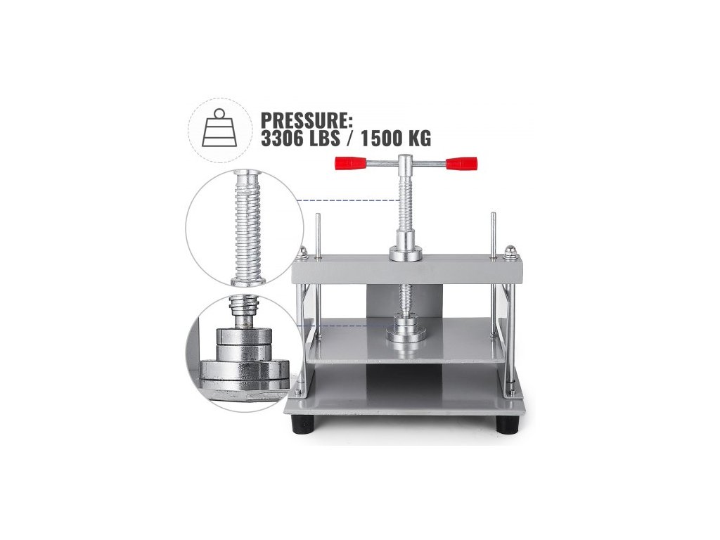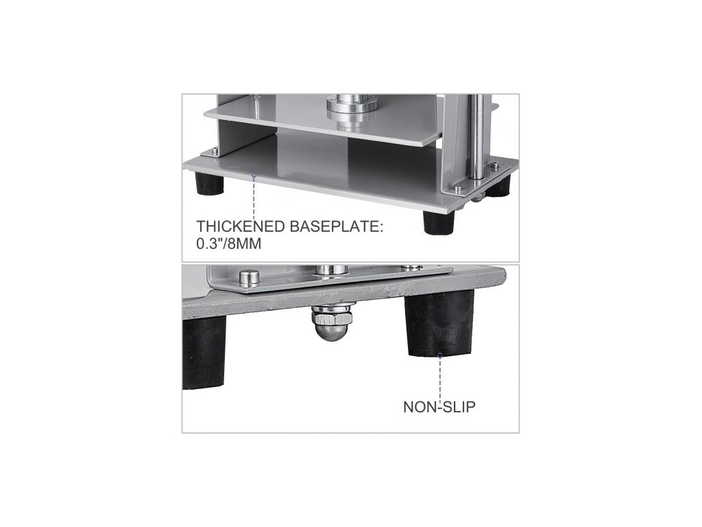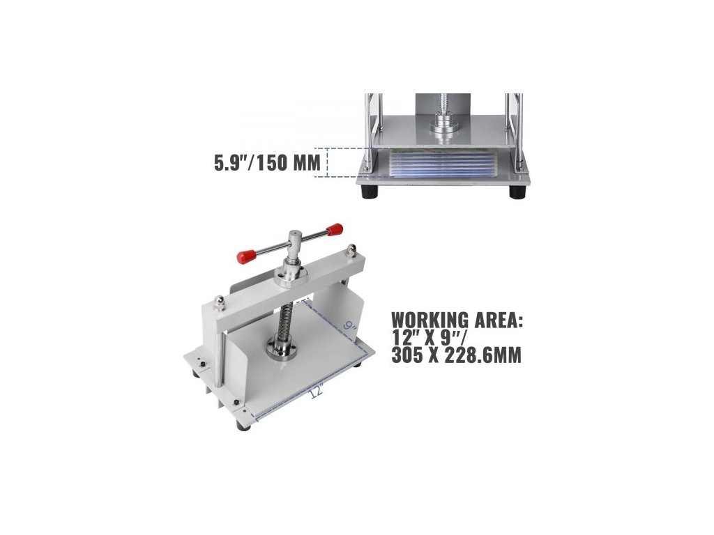 Tloušťka zploštění: 5,9" (150 mm),Efektivní pracovní plocha: 12" x 8,7" (305 x 220 mm),Rozměry položky: 14,6" x 8,7" x 12,9" (370 x 220 x 330 mm),Základní deska: 0,3" (8 mm),Tlak: 3306 lbs (1500 kg),Hmotnost položky: 36 lbs (16 kg)