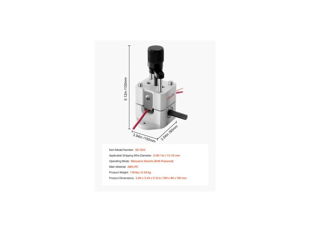 Použitelný průměr odizolovacího drátu: 0,06-1 palce / 1,5-25 mm,Číslo modelu položky: SD-003,Hmotnost výrobku: 1,19 lbs / 0,54 kg,Provozní režim: Ruční nebo elektrický (s vrtačkou),Rozměry výrobku: 3,94 x 3,54 x 5,12 palce / 100 x 90 x 130 mm,Hlavní materiál: ABS+PC