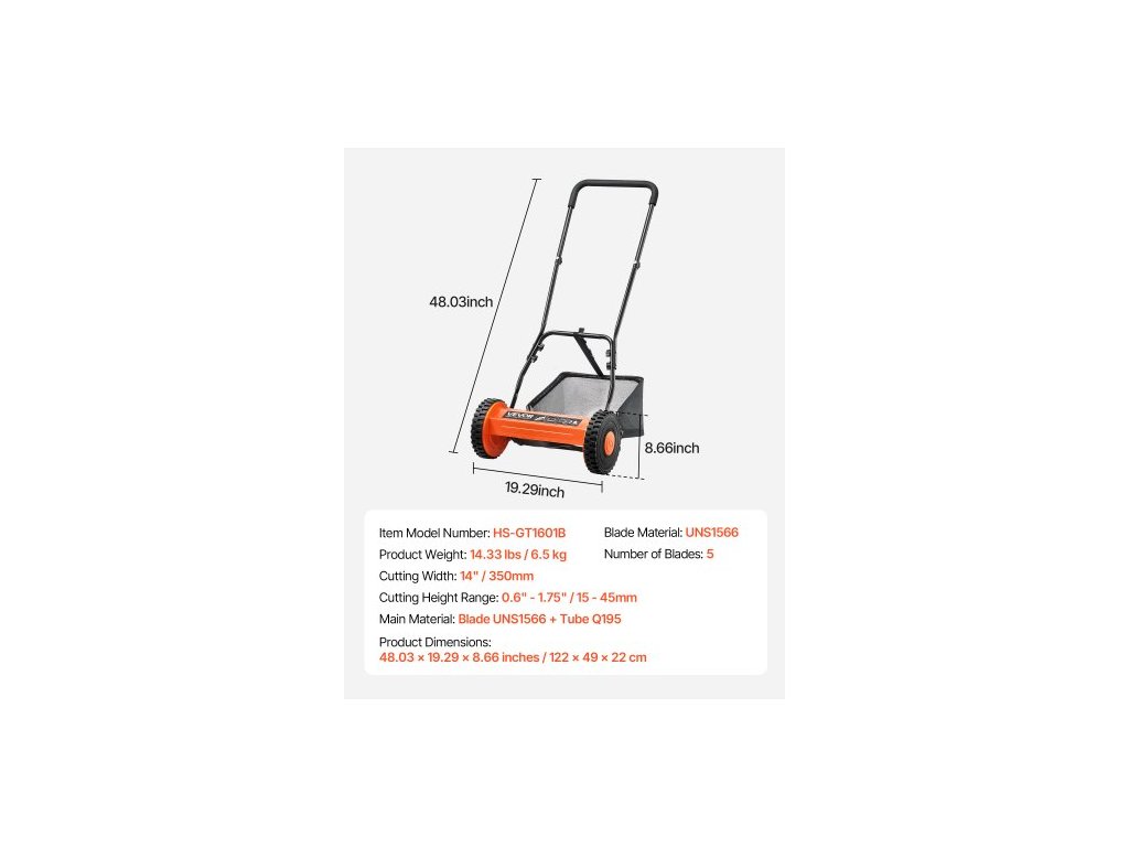 Materiál nožů: UNS1566,Rozsah výšky sečení: 15 - 45 mm,Číslo modelu: HS-GT1601B,Šířka sečení: 350 mm,Hmotnost výrobku: 6,5 kg,Počet nožů: 5,Rozměry výrobku: (D x Š x V) 122,7 x 49,9 x 21,9 cm 122 x 49 x 22 cm, Hlavní materiál: Čepel UNS1566 + Trubice Q195