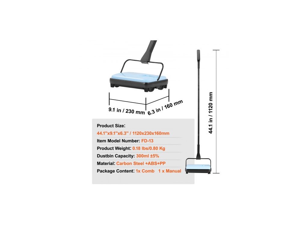 Materiál kartáče na okraje: PVC,Délka zametání: 7,87 palce/200 mm,Objem nádoby na prach: 300 ml ±5 %,Rozměry: 44,1 x 9,1 x 6,3 palce / 1120 x 230 x 160 mm,Materiál hlavního kartáče: Drát + PP,Číslo modelu: FD-13,Čistá hmotnost: 0,18 lbs / 0,8 kg,Hlavní materiál: Uhlíková ocel + ABS + PP,Materiál koleček: PP+TRP