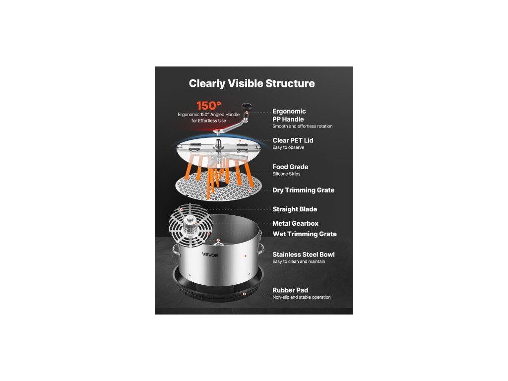 Materiál misky: nerezová ocel 201, čepele: 4 × 3, materiál víka: PET, číslo modelu: V-BT-TS-12, rozměry: 13,8 × 13,8 × 12,4 palce / 350 × 350 × 315 mm, hmotnost: 7,9 lbs / 3,6 kg, rukojeť: hliníková rukojeť s úhlem 145°