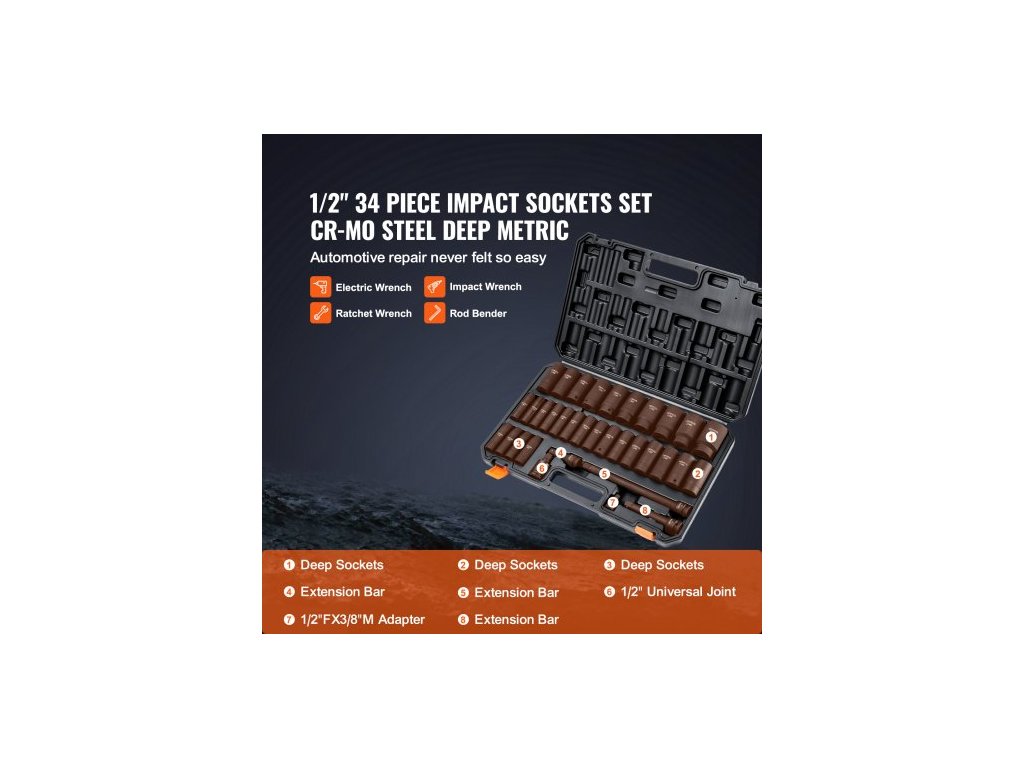 Sada hlubokých rázových nástrčných klíčů 1/2" Drive, 34dílná sada nástrčných klíčů, metrické (8-36 mm), 6hranná Cr-MO legovaná ocel pro opravy automobilů, robustní konstrukce, včetně odolného úložného pouzdra.
