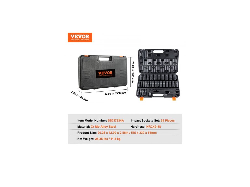 Sada rázových nástrčných klíčů: 34 kusů,Číslo modelu položky: SS217834A,Materiál: Cr-Mo legovaná ocel,Tvrdost: HRC42-48,Čistá hmotnost: 25,35 lbs / 11,5 kg,Rozměry výrobku: 20,28 x 12,99 x 2,56 palce / 515 x 330 x 65 mm