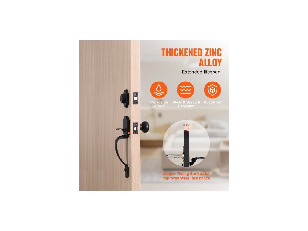 Vhodná tloušťka dveří: 1-3/8 až 1-3/4 palce (35-45 mm),Délka západky: 2-3/8 nebo 2-3/4 palce (60/70 mm),Barva: Matná černá,Číslo modelu položky: 20185-10B,Hmotnost výrobku: 2,4 lbs / 1,1 kg,Hlavní materiál: Slitina zinku,Rozteč otvorů vnější kliky: 7-11/16 až 8-13/16 palce (195–224 mm)