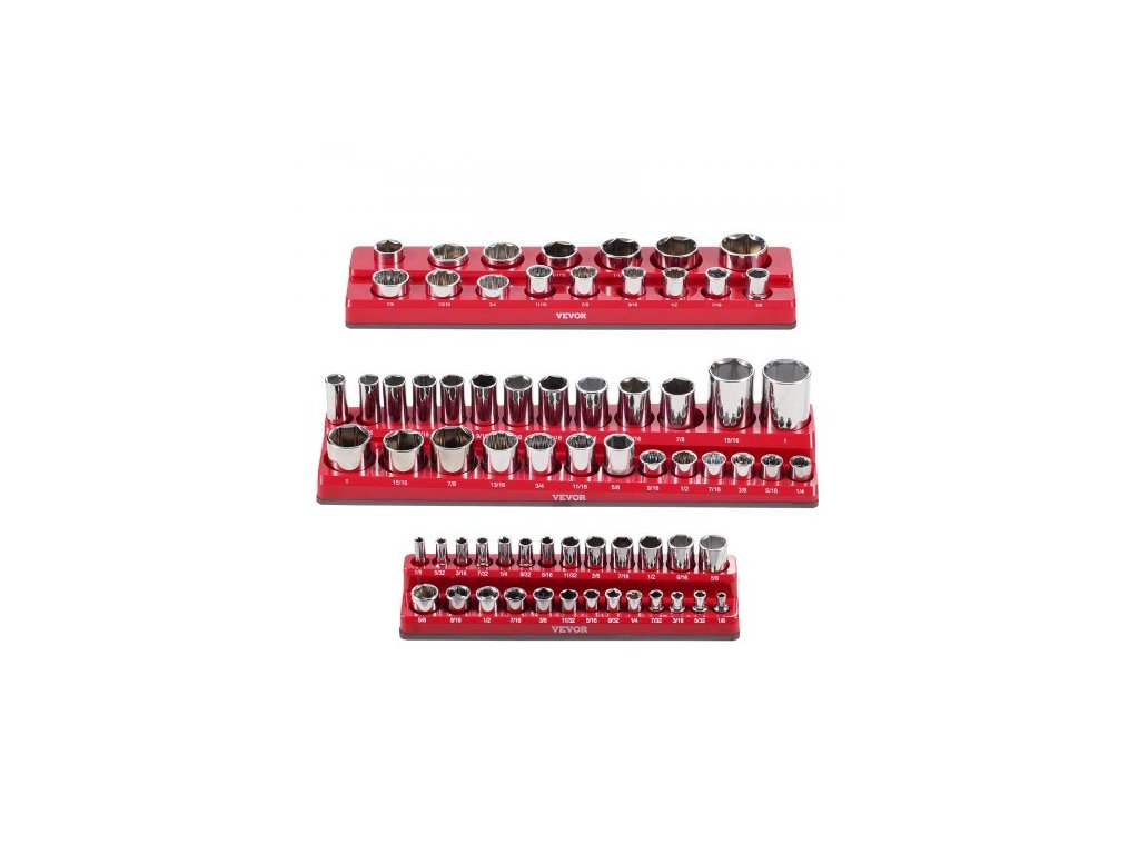 Sada magnetických organizérů na nástrčné klíče , 3dílná magnetická přihrádka na nástrčné klíče, držáky na nástrčné klíče SAE 1/4'', 3/8'' a 1/2'' s průhlednými štítky, pojme až 68 ks standardních a hlubokých nástrčných klíčů, červená (nástrčné klíče nejsou součástí balení)
