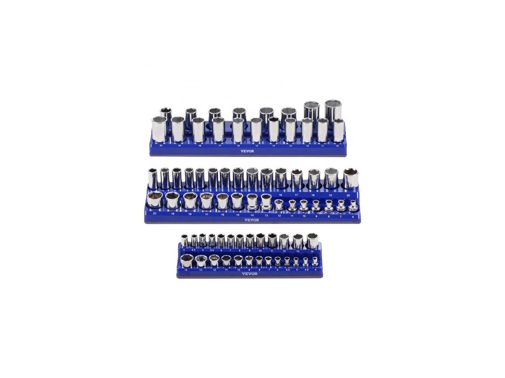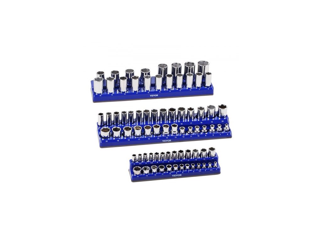 Sada magnetických organizérů na nástrčné klíče , 3dílná magnetická přihrádka na nástrčné klíče, metrické držáky na nástrčné klíče 1/4'', 3/8'' a 1/2'' s průhlednými štítky, pojme až 75 ks standardních a hlubokých nástrčných klíčů, modrá (nástrčné klíče nejsou součástí balení)