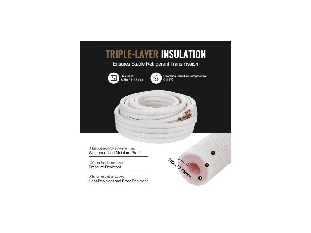 Sada mini splitového potrubí 15240 mm, měděné trubky s vnějším průměrem 6,4 a 9,5 mm a trojvrstvá izolace, pro mini split klimatizaci, chladicí nebo topná čerpadla a HVAC s ovíjecími páskami.