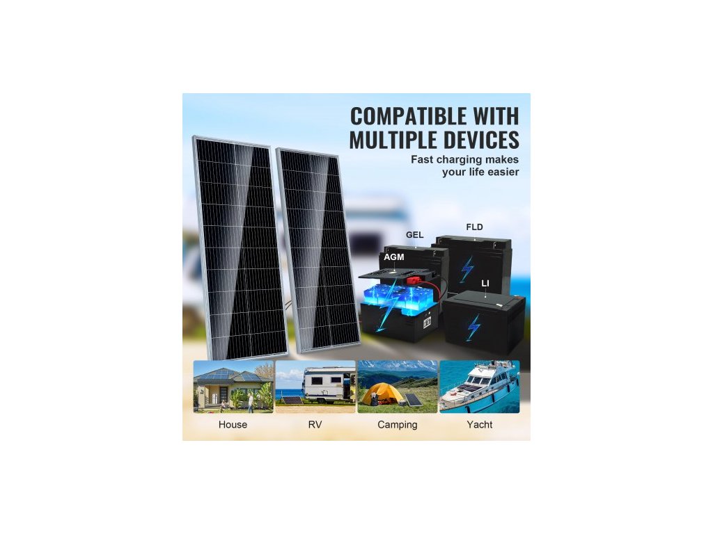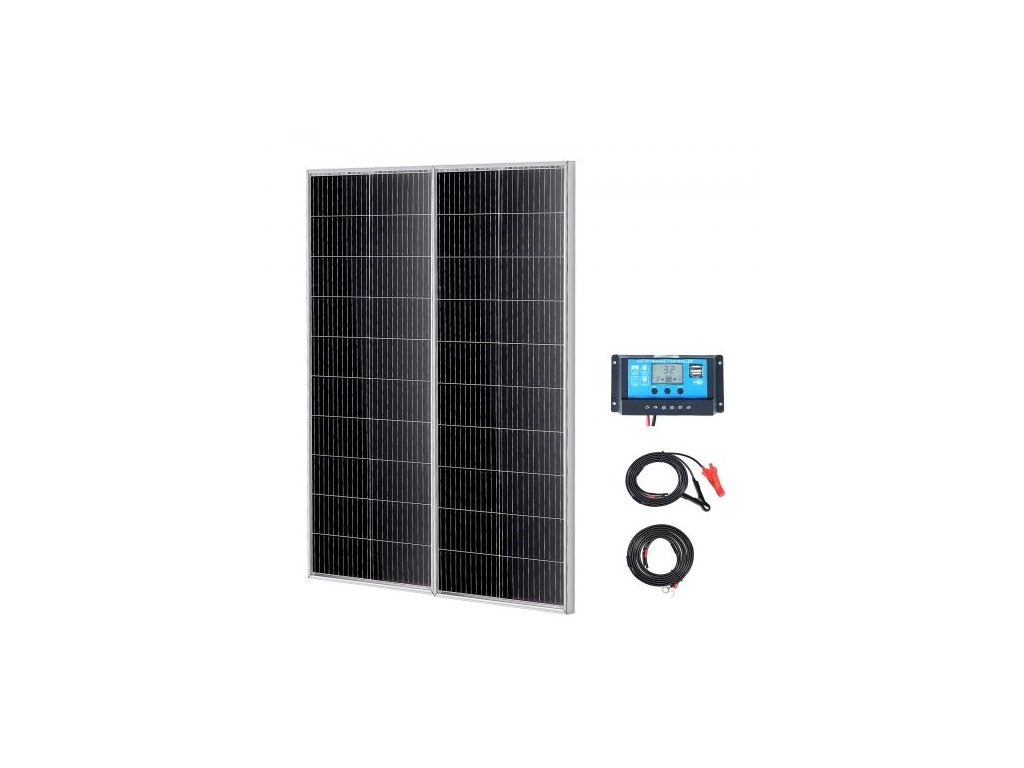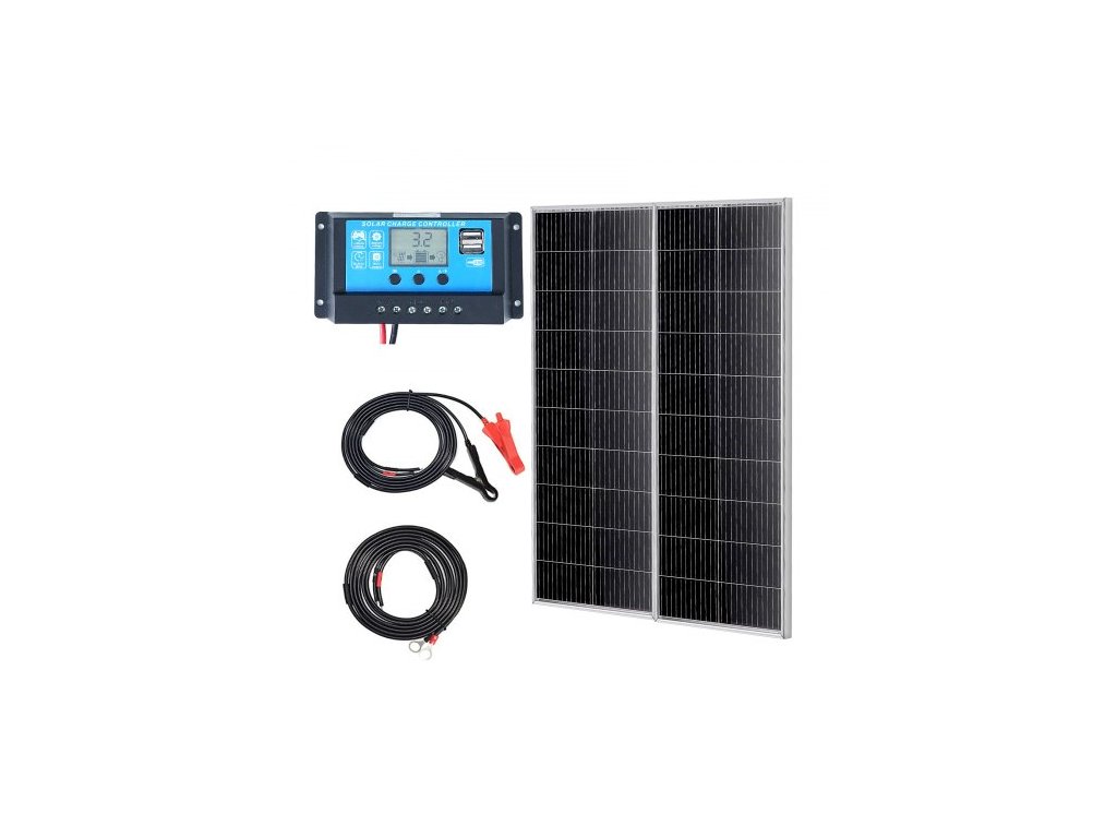 Sada monokrystalických solárních panelů 200W, 2 ks monokrystalických solárních panelů + regulátor nabíjení, 23% vysoce účinný monokrystalický fotovoltaický modul, vodotěsný s krytím IP68 pro obytné vozy, lodě, kempování a offline systémy