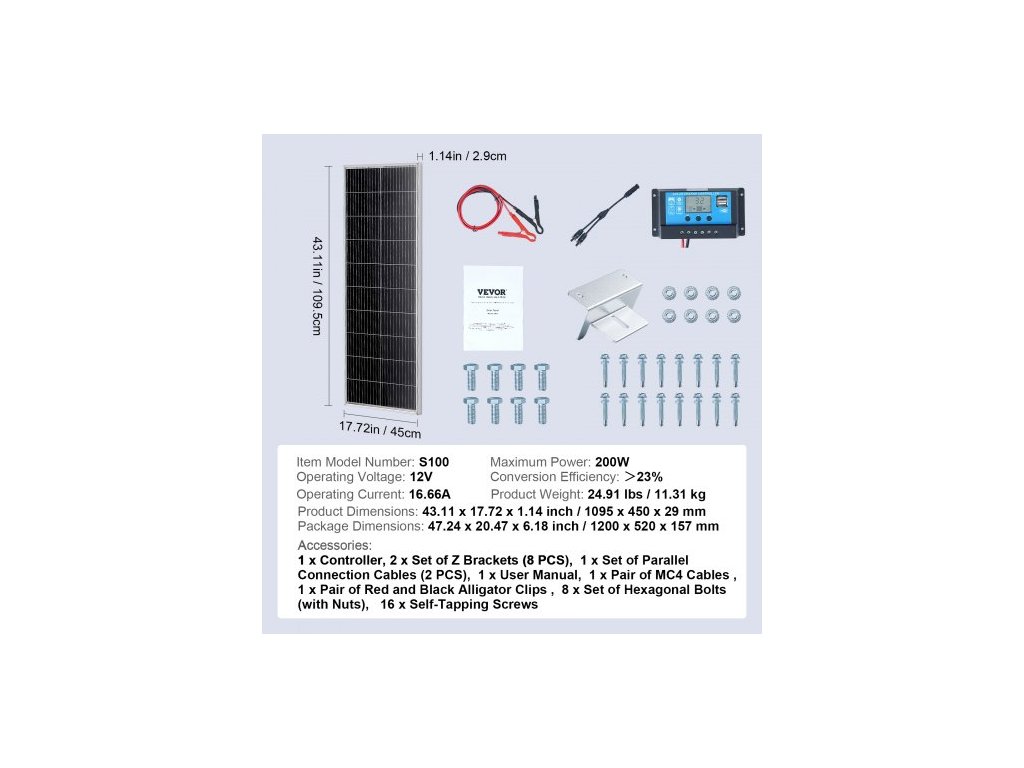 Účinnost konverze: > 23 %,Provozní teplota: -10 °C - 65 °C (optimální při 25 °C),Maximální výkon: 200 W,Provozní proud: 16,66 A,Rozměry balení: 47,24 x 20,47 x 6,18 palce / 1200 x 520 x 157 mm,Provozní napětí: 12 V,Číslo modelu položky: S100,Hmotnost výrobku: 24,91 Hmotnost 11,31 kg, Rozměry produktu: 1095 x 450 x 29 mm