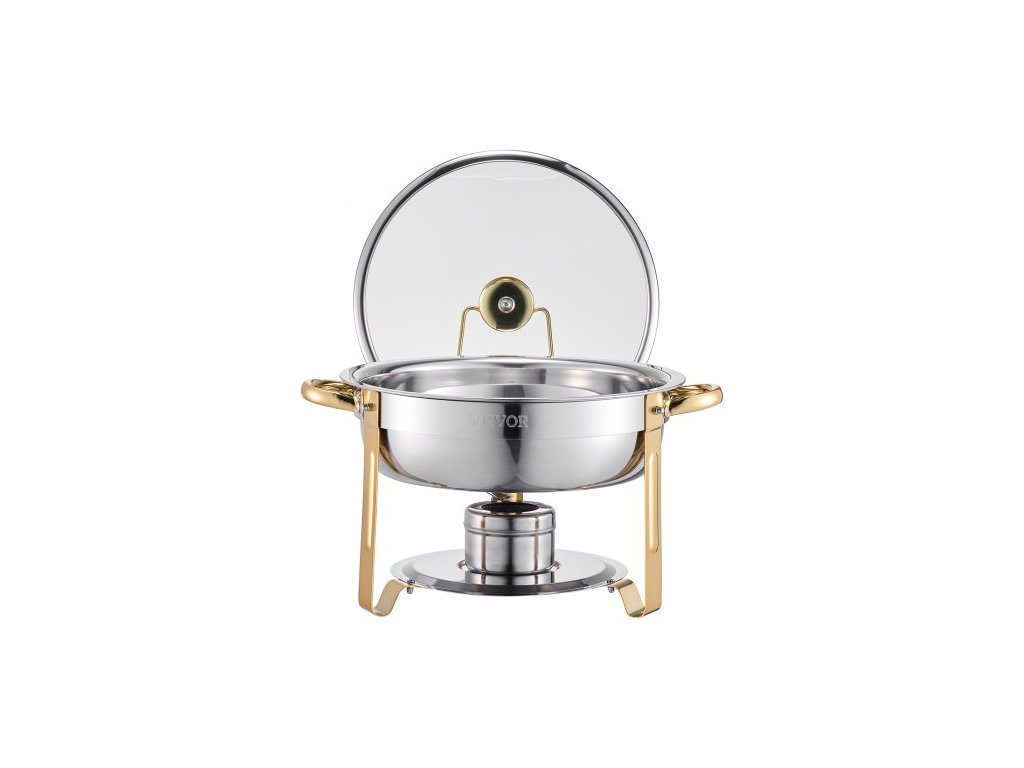 Sada na ohřívání jídla Chafing Dish, balení po 4 kusech, nerezová ocelová podnosná pánev se 4 pánvemi plné velikosti, kulatý ohřívač jídla na catering se skleněným víkem, skládací pánev na vodu, držák na palivo, pro svatební hostinu, banket, zlatá