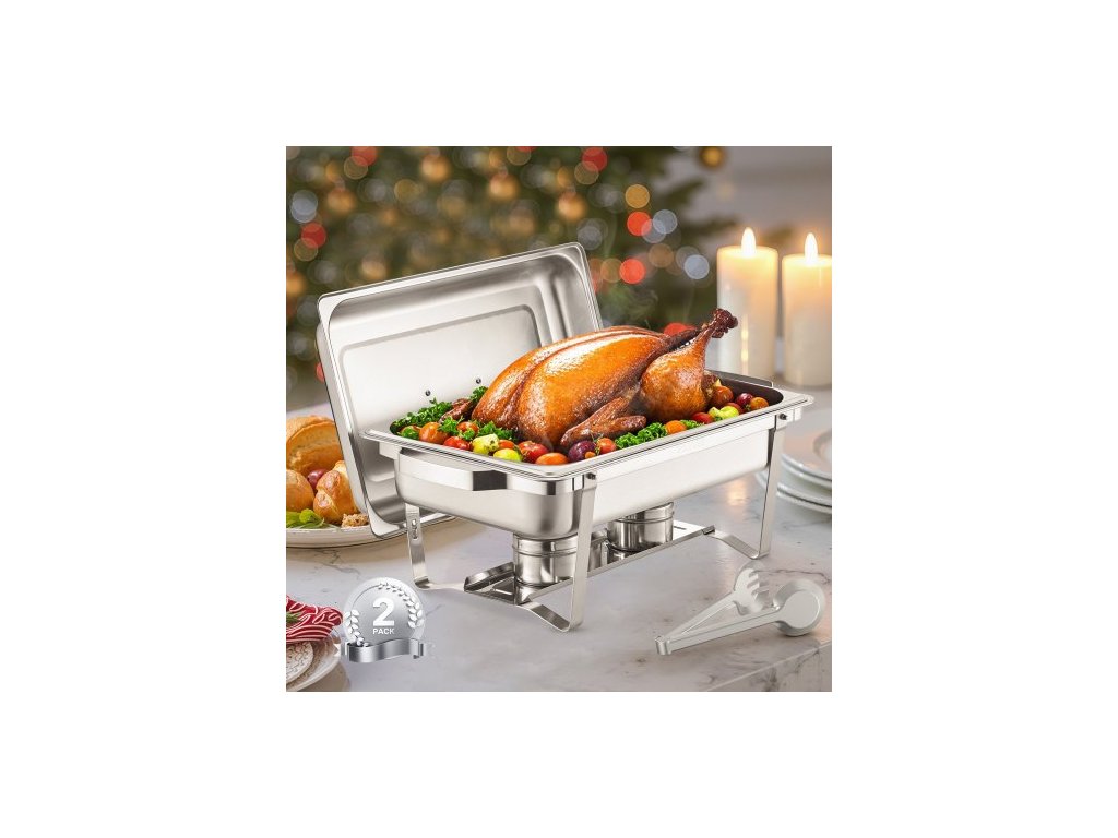 Sada talířů Chafing Dish Buffet, 2 kusy, 8 qt, nerezová ocelová podpěra se 2 pánvemi plné velikosti, obdélníkový ohřívač nádob na catering s víkem, stojanem na pánve s vodou, držákem na palivo, pro svatby, večírky, bankety, stříbrná