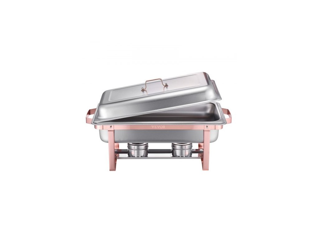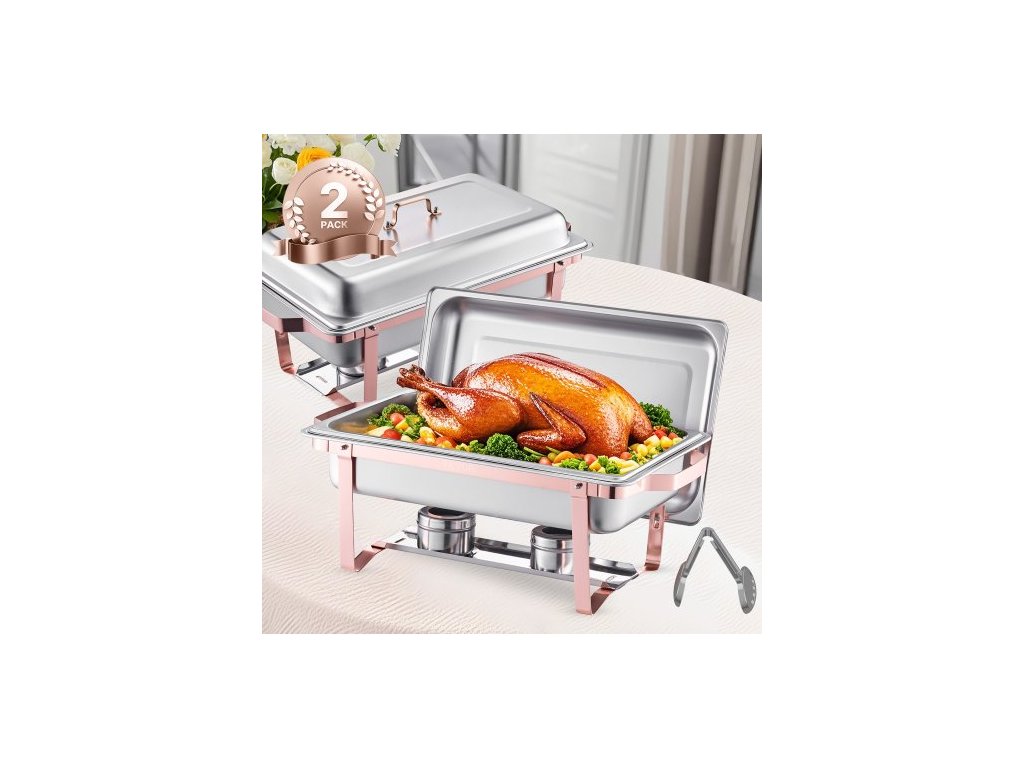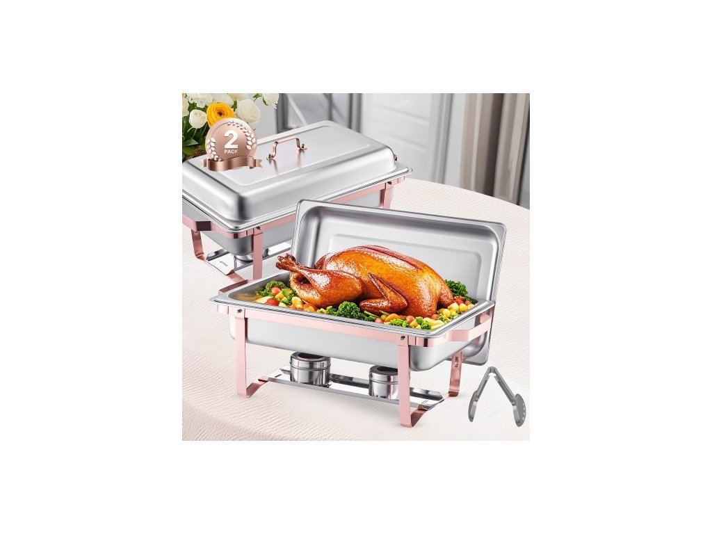 Sada talířů Chafing Dish Buffet, 2 kusy, 8 qt, nerezová ocelová podpěra se 2 pánvemi plné velikosti, obdélníkový ohřívač cateringových nádob s víkem, stojanem na pánve s vodou, držákem paliva, pro svatební hostinu, hostinu, růžové zlato
