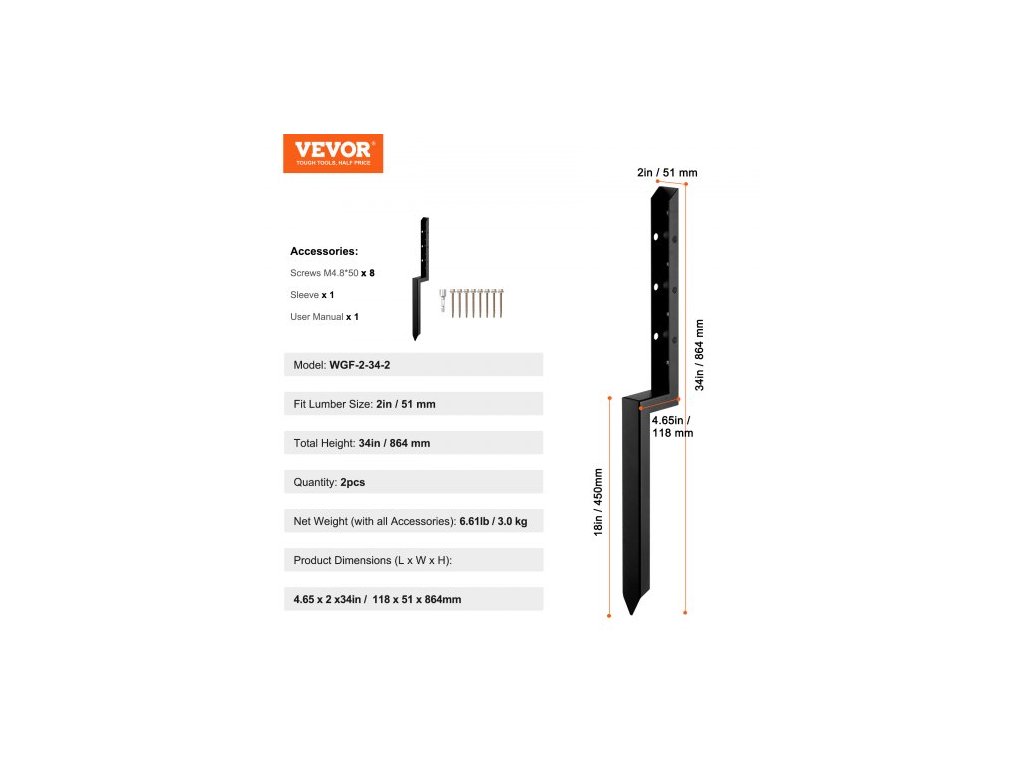 Model: WGF-2-34-2,Vhodná velikost řeziva: 2 palce / 51 mm,Množství: 2 ks,Rozměry výrobku (D x Š x V): 4,65 x 2 x 33,78 palce / 118 x 51 x 858 mm,Čistá hmotnost (s příslušenstvím): 6,61 lb / 3,0 kg,Délka hřebíků: 18 palců / 450 mm ±10 mm,Tloušťka materiálu: Hřebíková deska: 2,2 mm, Upevňovací deska sloupku: 2,2 mm, ±0,2,Hlavní materiál: Ocel, Celková výška: 864 mm