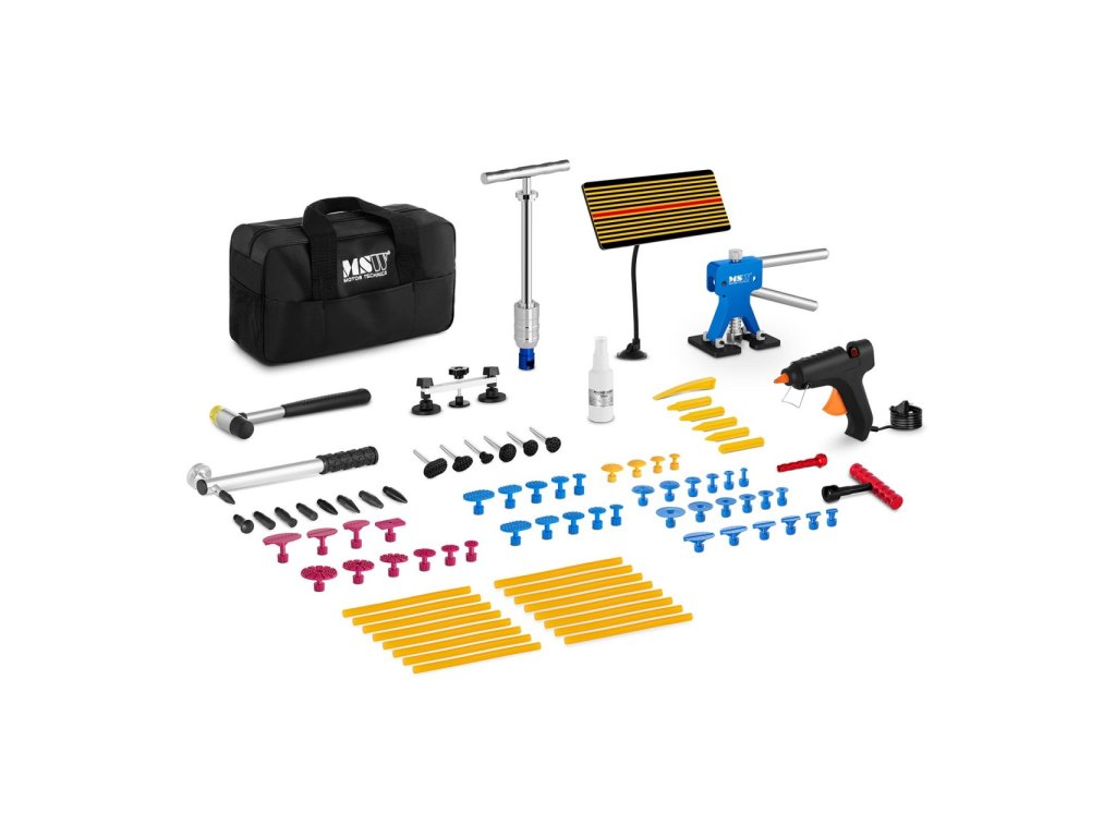 Sada na opravu promáčklin - 90 ksRozsáhlá sada na opravu promáčklin obsahuje všemožné nářadí pro efektivní a zároveň šetrné odstranění menších i větších důlků a promáčklin karosérie. K dispozici budete mít několik vytahovacích přípravků, pomocí kterých můžete obzvlášť jemným způsobem vytahovat karoserie osobních automobilů, nákladních automobilů nebo motocyklů. Díky snadné manipulaci s těmito nástroji je mohou používat jak profesionálové v autoservisu, tak i zkušení laici.